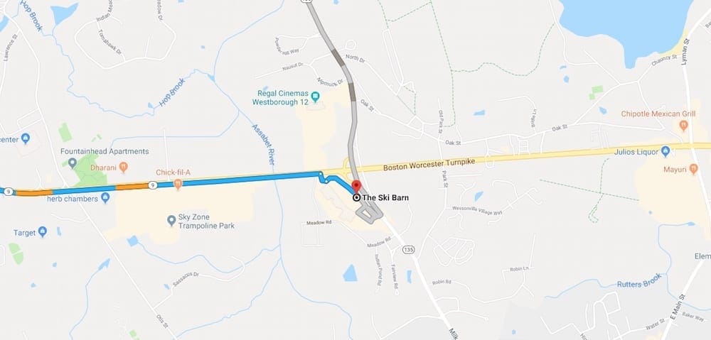The Ski Barn is located in the Westmeadow Plaza in the center across from Ocean State Job Lots. Rt. 9 East 166 Milk St. Westboro, MA.  01581